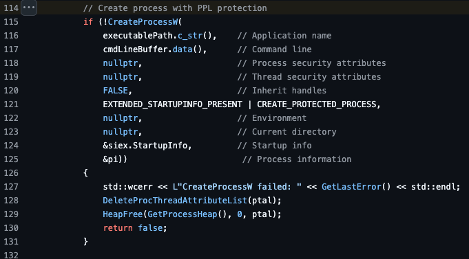 To create a process and enable this PPL functionality, the CreateProcess function must use the dwCreationFlags EXTENDED_STARTUPINFO_PRESENT | CREATE_PROTECTED_PROCESS.