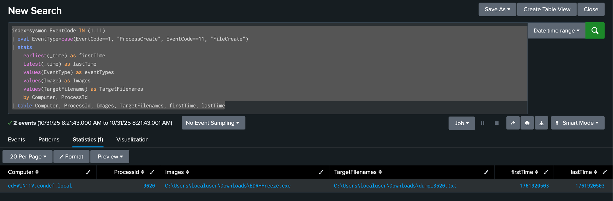 EDR-Freeze eases tampering with security products by relying on existing defensive tools without worrying about exploiting vulnerabilities. Customizing the sleep time allows further activity to be carried out without worrying if the EDR/AV will detect it. Although there were only a handful of logs to look at, there were enough patterns to help hunt for this activity without relying on hard-coded file names or paths.