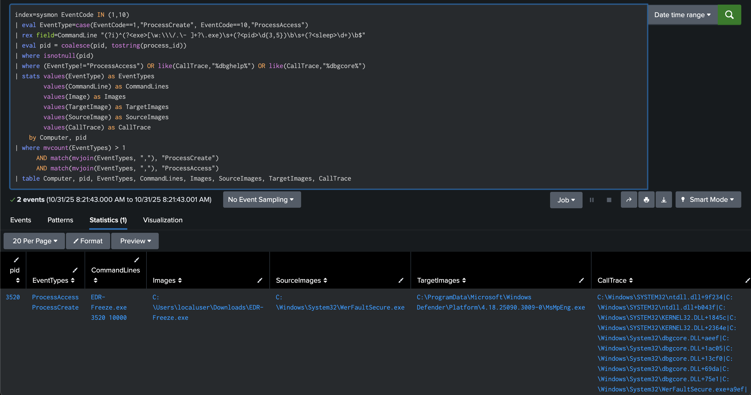 Similar to the above query, WerFaultSecure should load nearly immediately after EDR-Freeze. This query will correlate PID values instead of time deltas. Since EDR-Freeze requires the PID of an AV/EDR process and WerFaultSecure has to pass a PID to MiniDumpWriteDump so that it can suspend a process, both processes executing will have the same PID in the command line execution. One addition here is to look for the inclusion of dbghelp.dll or dbgcore.dll in the CallTrace field to limit false positive hits.