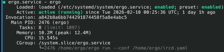 After creating a systemd service for Ergo and securing it away under a separate user, I had it running.