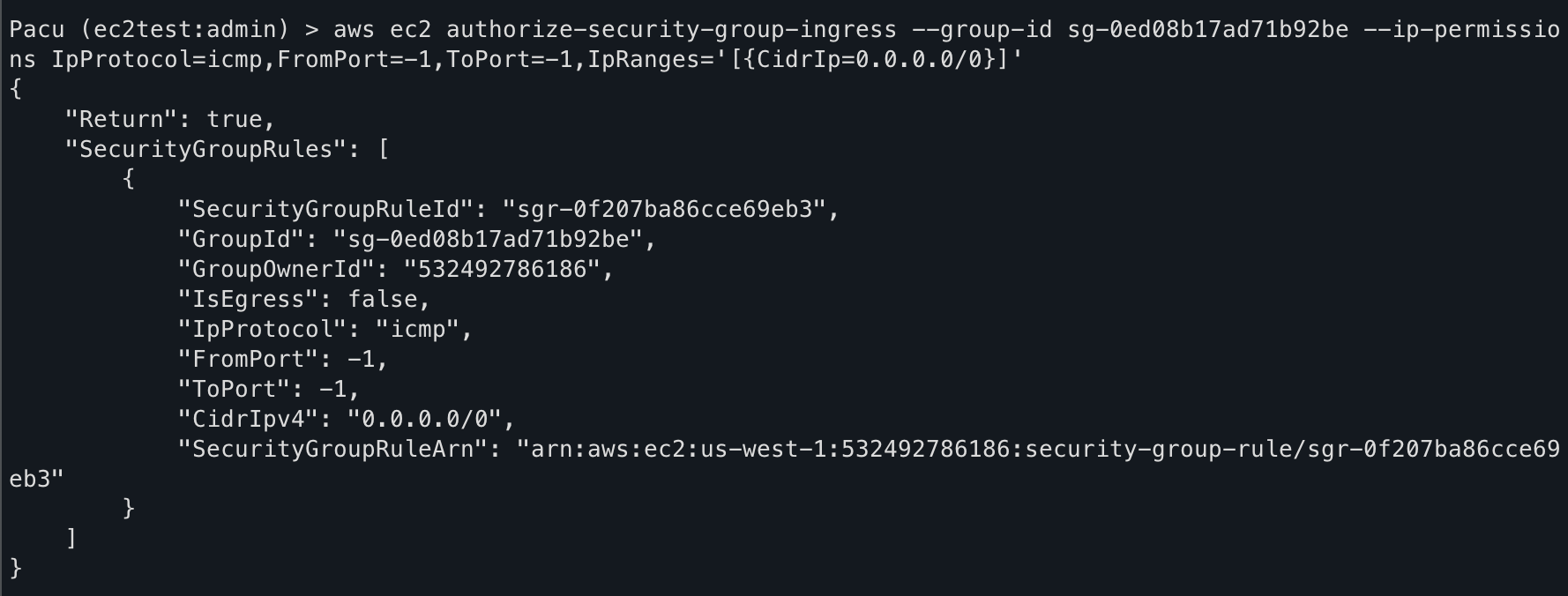 Recon is important but what about something with a little more impact? Pacu has a module to backdoor existing security groups by opening a range of ports using UDP, TCP, ICMP or ALL. Since default AWS security groups block all ingress traffic and my custom security group doesn't allow ICMP, I checked if Pacu had a way to enable it for me.