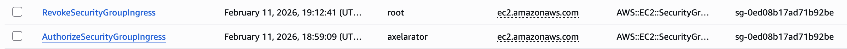 Ping successful! Back in CloudTrail, the logs show an ingress rule was created by axelarator. The second log as root is because I was logged into the management console as the root user to delete the rule after I confirmed a successful ping.