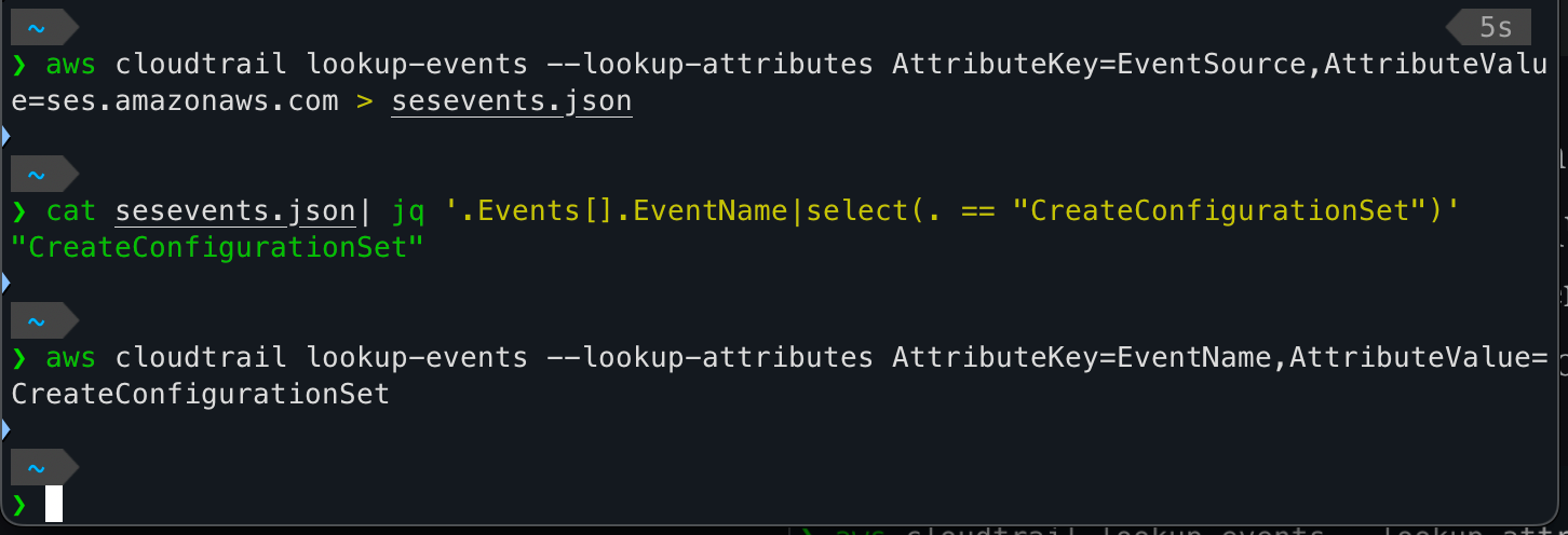 Since I created an SES configuration set and other activity to setup that SMTP provider, that activity had to be in CloudTrail somewhere. I used the CLI to query on EventSource ses.amazonaws.com and saved the results to a JSON file. Then I checked if the EventName CreateConfigurationSet existed and it does. The final command actually outputs to less so it isn't a blank output. The JSON blob is a partial output of that command.