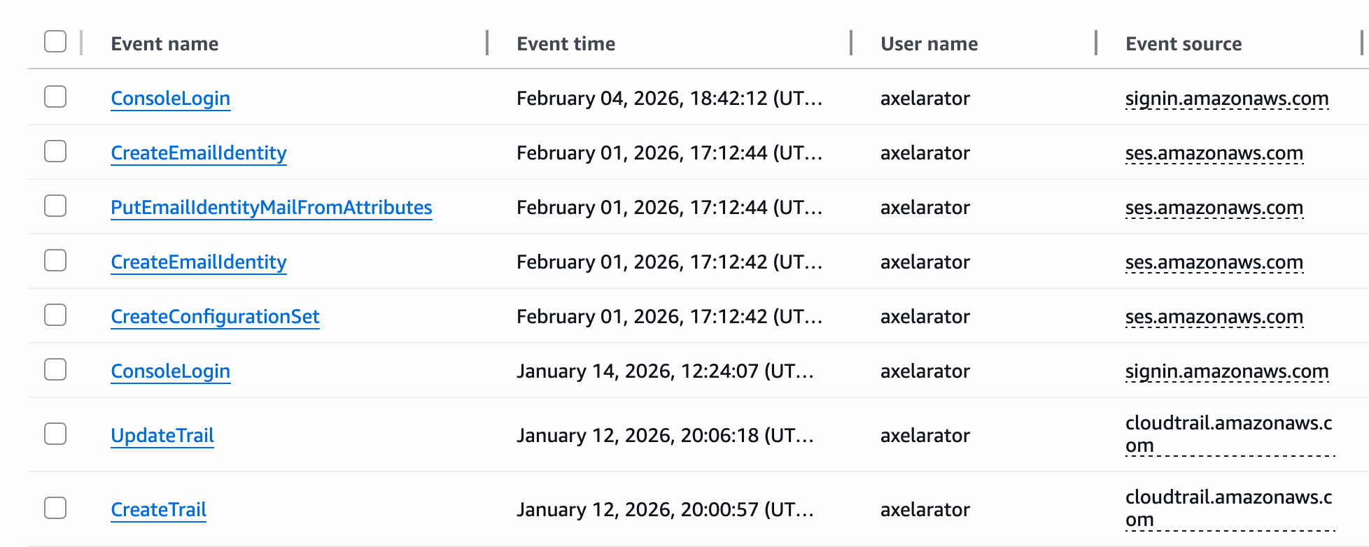 Other activity along with the rest of the SES process can also be seen from the CloudTrail portal. From bottom-up, I created a trail, attempted to update a non-existent trail, created a configuration set in SES, added my personal email and the MAIL FROM address.