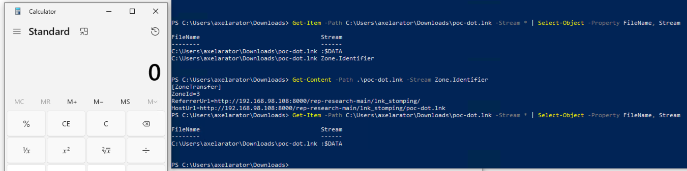 To provide a more visual explanation, taking the PoC GithHub repo above, you can view the data streams within the ZIP file (Get-Item) and view the contents to see where it came from (Get-Content). I downloaded the ZIP directly because cloning the repo only provides a $DATA stream. The Git client simply does not have a Zone.Identifier ADS which can also be treated as a way to bypass MotW.