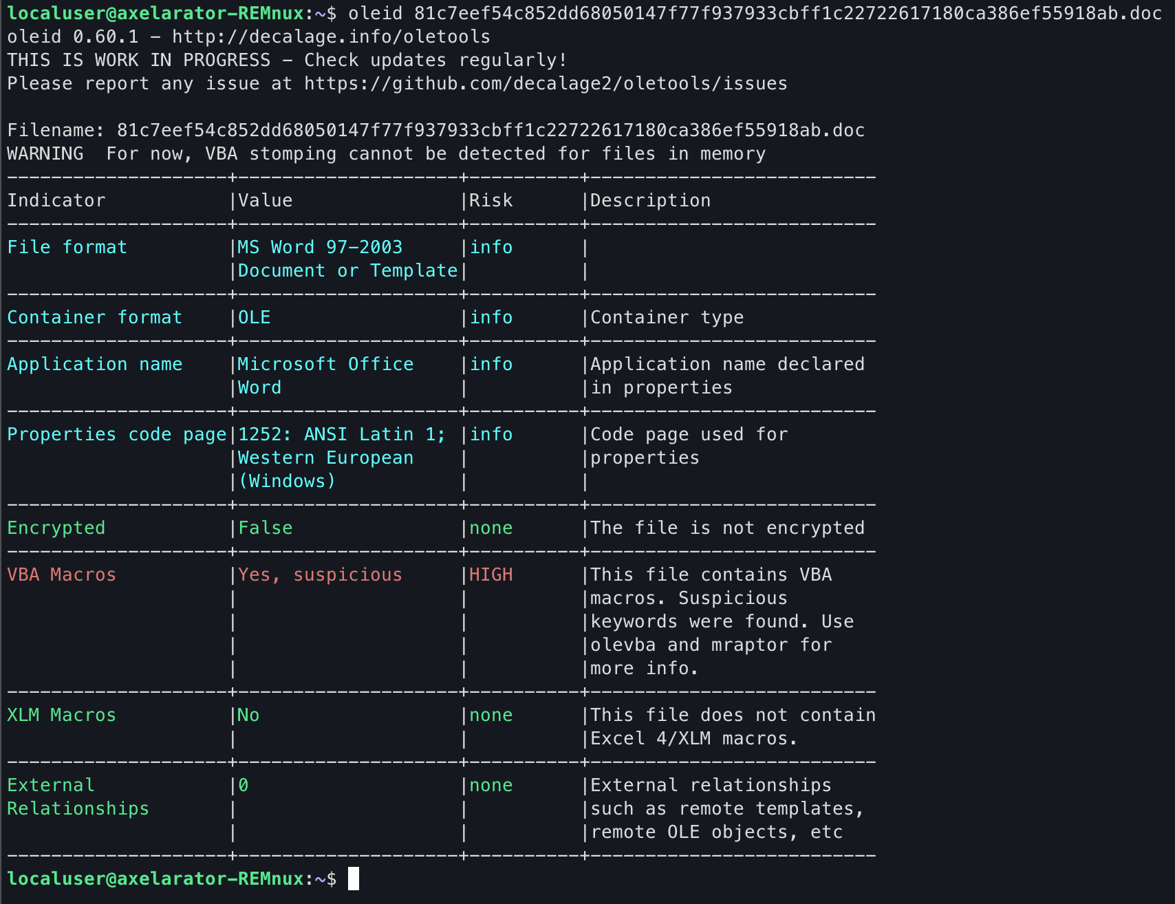 The first tool to use is oleid which is used to analyze OLE files and detect specific characteristics found in malicious files. From the output below, it found the VBA macros and listed them as high risk.