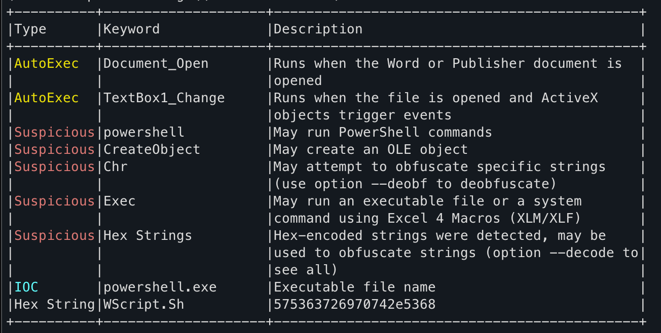 Jumping ahead a bit, olevba provides a tabular output of the findings. In it shows the value 575363726970742e5368 is an XOR encoded string which decodes to WScript.Sh. The second half of the CreateObject function might be pretty obvious at this point. 656c6c is also an XOR string that decodes to ell. Put both together now and you have WScript.Shell, an object that allows running additional code like PowerShell payloads or cmd.exe.