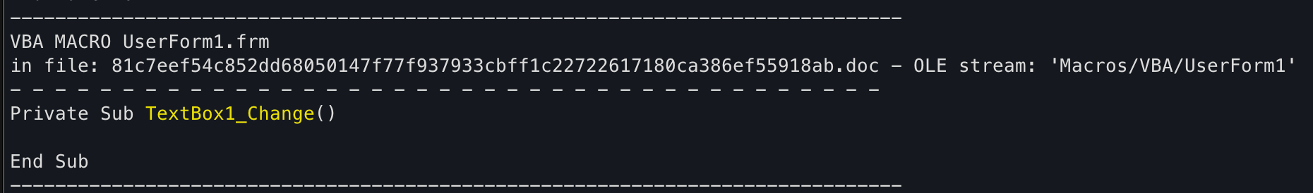 From the VBA Macros description, the next step is to use olevba which will extract and analyze the macro source code from Office documents.