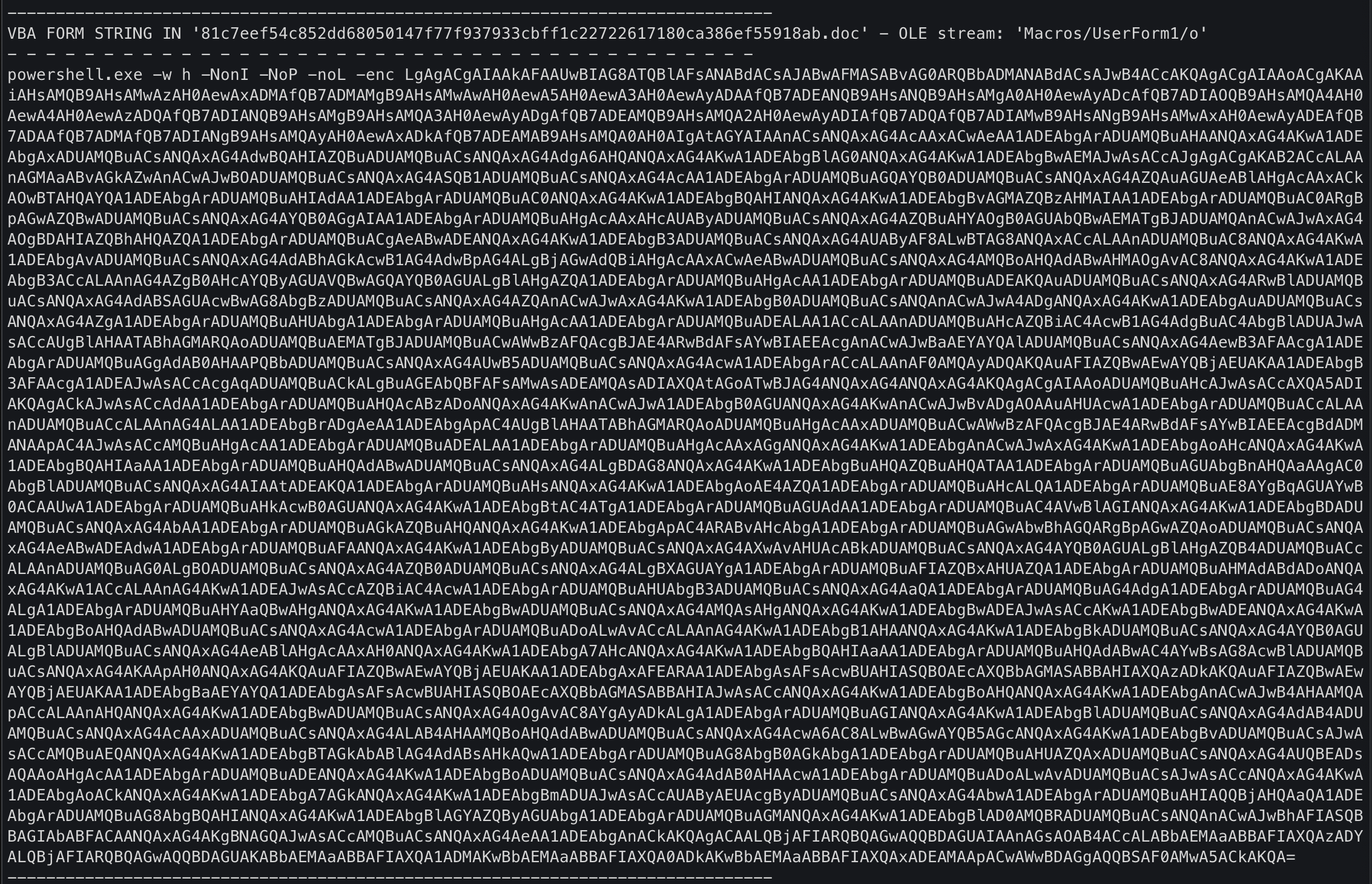 The UserForm1 macro suggests that empty function above wasn't really empty after all. With some simple base64 deobfuscation followed by decoding the PowerShell encoding flag using UTF-16LE, there was more work to be done. I needed some assistance from PowerDecode to help further deobfuscate this code.